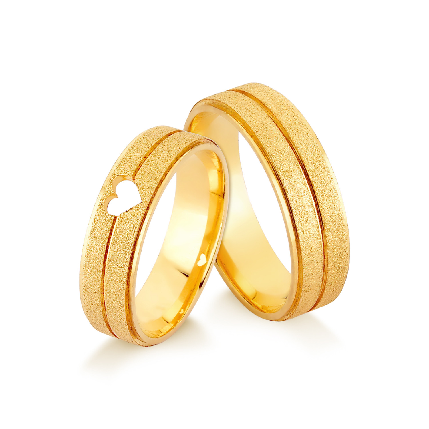 Aliança em ouro amarelo 18kt com coração vazado diamantada e semi anatômica