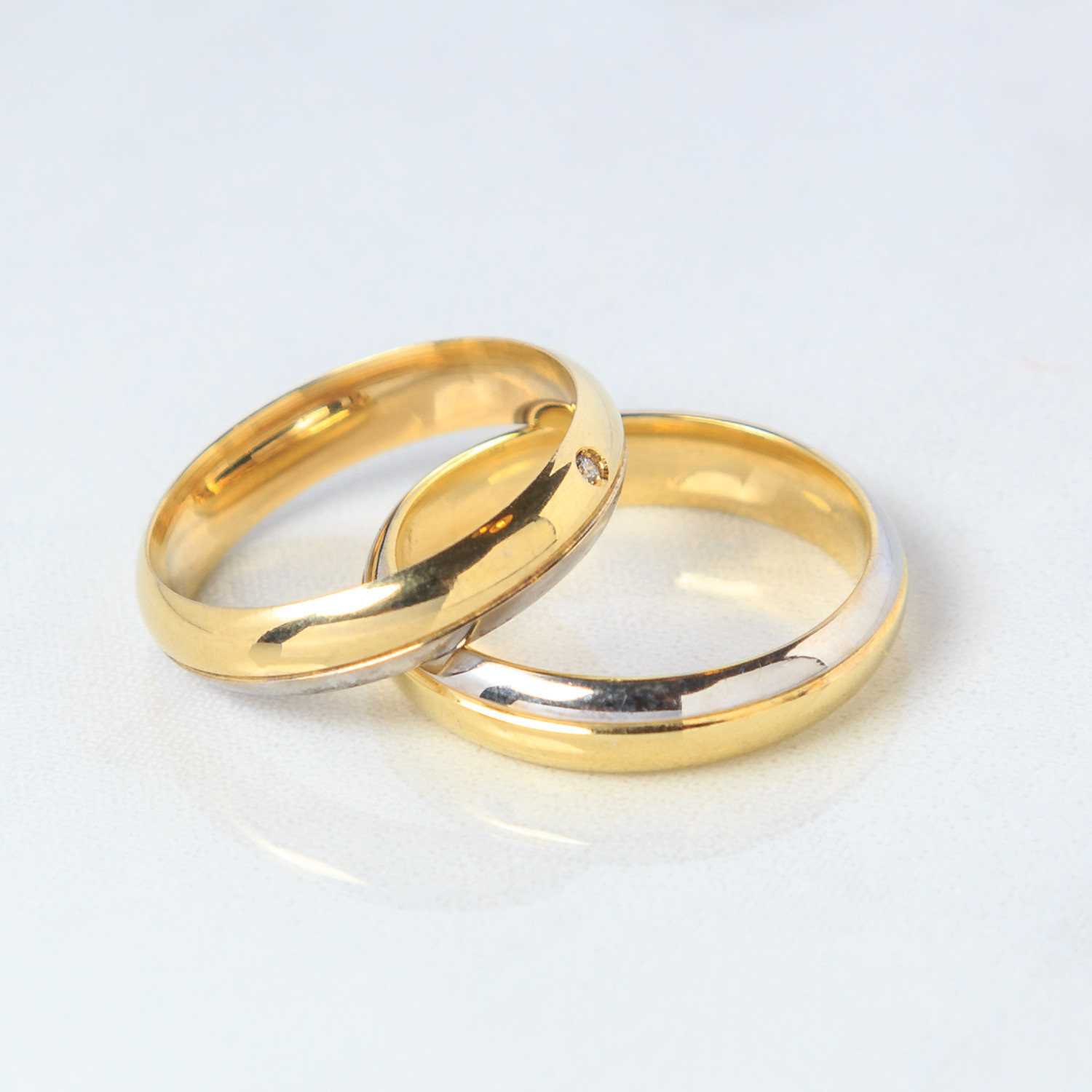 Aliança em ouro amarelo e ouro branco 18 kt, anatômica com 1 diamante com 0,01 ponto