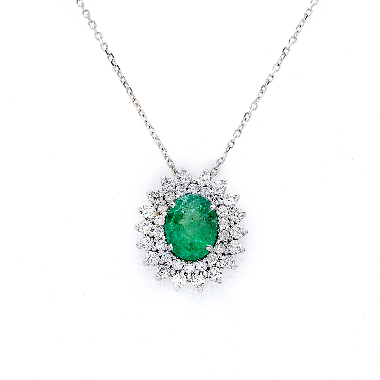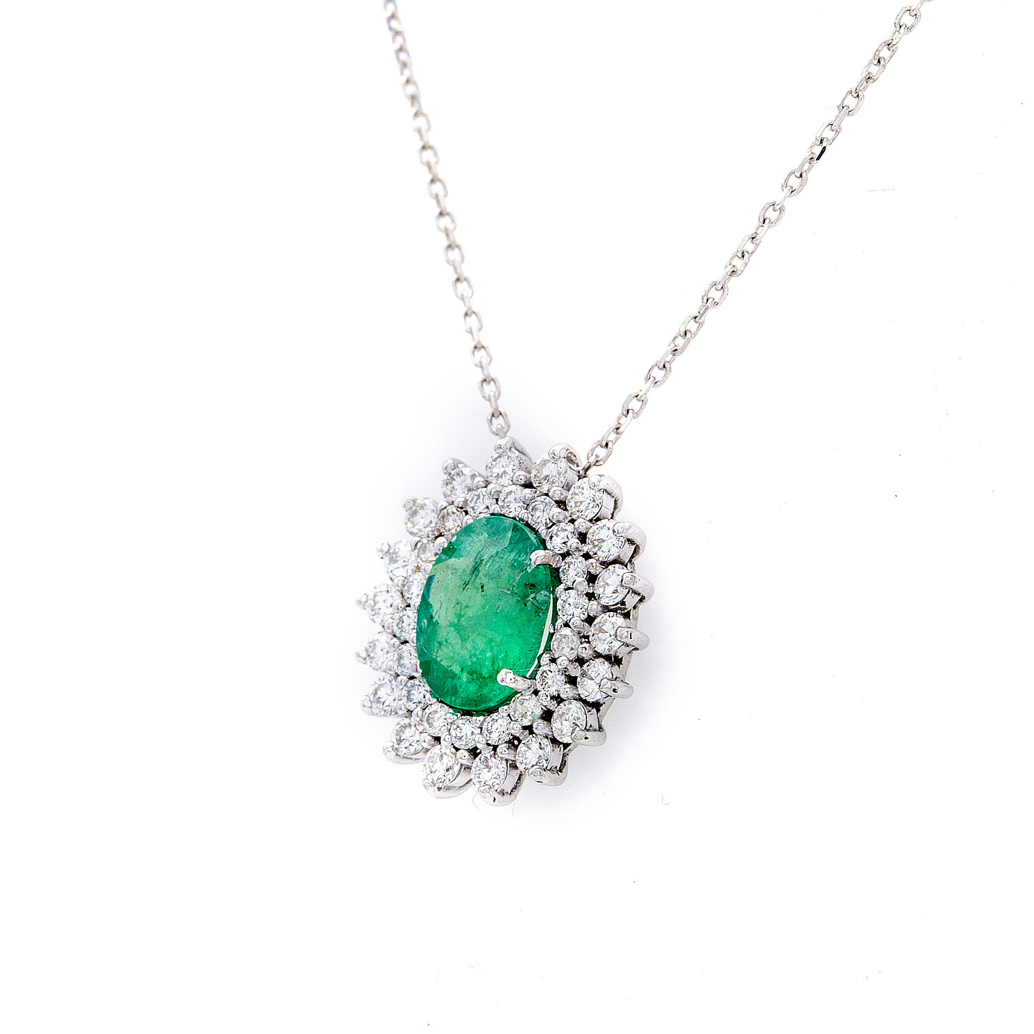 Corrente com pingente em ouro branco 18 k com brilhantes e esmeralda
